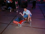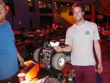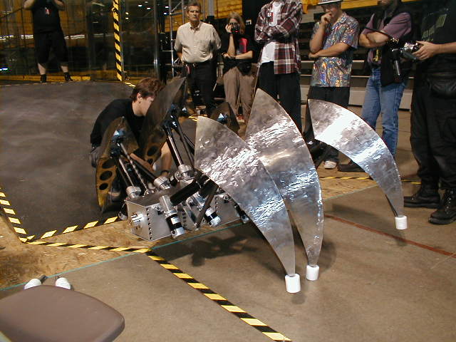 The first thing I heard when I walked into the Pyramid on the first day of competition was an annoying bark coming over the PA system. This would turn out to be the announcer for the duration of the competition. It was in fact "Hawk" from the now defunct TV show American Gladiators. The only way he could describe me is as "the guy with the sideburns down to his knees.." Hmmm To put it mildly he sucked. He should stick to his day job (PhD Economist -!-). Enough of that though, on to the robot fights! I checked the schedule as soon as I got in, and it turned out that I was scheduled to fight "Gold Digger" in the first round. Not only was this robot not complete, but it also was not in the Megabot weight class. I ended up getting a bye, which was ok, but I would have liked to have gotten out there sooner. I wasn't scheduled to fight until the afternoon now. The morning battles were pretty cool. You never can really get the feel of two 200 pound robots smashing into one another until you see it in person. We spent the rest of the morning watching fights and making sure that Son of Smashy was going to be ready for his first match. After the lunch break I found out that I'd be going up against a robot named "Ankle Biter", which was a wedge shaped robot with a big, scary milling blade sticking out of its sloping front. I was a bit worried of this as the materials I used for armour (IE plastics: lexan and UHMW) were easy to cut through. Also, from the looks of the inside of Ankle Biter, it had some serious drive motors and pushing power, which SOS lacks severly. The last point of concern was that the wedge shape was made out of reasonably thick aluminum, and the builders had even bolted some extra <" plate on top right where my smasher was more likely to hit. I really wasn't thinking about winning, rather I just wanted to get out there and actually get to try out Son of Smashy in its intended environment. The wait for the match was pretty agonizing. But then the moment came We pulled the robot into the Battlebox and the fight was on. I don't remember the whole match, but there were a few key highlights. Early in the match Ankle Biter showed it's torque against SOS by plowing my robot into the spiked wall, at which point SOS ended up on top of Ankle Biter who was jammed against the wall. The real problem was that I couldn't just drive off him, as my wheels weren't making enough contact with the top of his robot. At that point, I just turned on the ax and left it on. The jarring action of the maul coming down shook Son of Smashy free and I drove off the top of the wedge. At some point after this, I got a clear blow in on the wedge in an essential area: right above his drive wheel. I bent his armour in against his wheel and he was unable to move anywhere but in a circle - at the time I didn't know that this is what had happened - I just considered myself lucky that he wasn't pushing me around anymore. At this point it was pretty easy to get good hits in on Ankle Biter. I just left the maul on and focused on aiming at his milling blade between shots. A few shots later, the maul came down heavily on his milling bade, it shattered in two, and then smoke poured out of the disabled Ankle Biter! Son of Smashy won his first match by K.O. - awesome! After the win, we pulled SOS out of the box, did the request interview and picked up my first BattleBots "winner" tag. Later, I went and checked on how badly Ankle Biter was damaged. It turned out that the shattered blade did something horrible to the electronics (I think) and the robot was pretty messed up. The builders, John MacKenzie and ? (sorry!) were really cool about it all, and they weren't mad or anything. They ended up giving me half of the blade, and I signed the other half for them. In the end, Ankle Biter was rebuilt and it saw competition again, but with a new set of saws. Son of Smashy didn't walk away completely unscathed either though. There were a couple big gashes in the UHMW underpan (one right under the batteries -!-), and an arena spike went right through the rear lexan armour panel - which was probably too thin - when Ankle Biter ran SOS into the wall. As it turned out that was the only match I was to compete in on Saturday, so the rest of the day was spent watching more matches and doing some repairs and preparations for the next day. After looking at the damage inflicted on Ankle Biter, we decided that it was good, but not quite enough. Someone (I think it was Curt Meyers, builder of Kill-O-Amp) suggested we put a spike on the end of the maul. Luckily, we had brought along a cold chisel with us that worked just dandy. We fired up the MIG welder we had also brought along and welded it to the top of the maul, with it extending approx 4" out in front. Steve then sharpened the maul with an angle grinder from the SORC workshop (Good job by SORC on this BTW). Before with the just the maul, the robot's weapon was pretty cool, but now with the sharpened spike it was damn scary! We tested the new configuration out in the SORC testing booth putting holes in the floor (and walls, and door etc) and we were happy. While in the booth, we saw a blue Nissan Pathfinder roll up to the loading bay of the Pyramid. It turned out to be Mark Setrakian, with his new robot Mechadon. At 450+ lb. it was enormous. Not only that, it was just plain incredible. We stuck around until Mark had it all together, and fired it up. Seeing it in action up close was great. I’m glad we waited it out. We had no idea what it was capable of until its demo on Sunday though. Back at the motel while watching the local news, we saw they were doing a story on BattleBots. Not only that, but there were a couple of clips of Son of Smashy’s match against Ankle Biter! A good way to end the day. To see more pictures from Saturday, click below: More Pictures from Saturday 1 and 2Previous - Next |