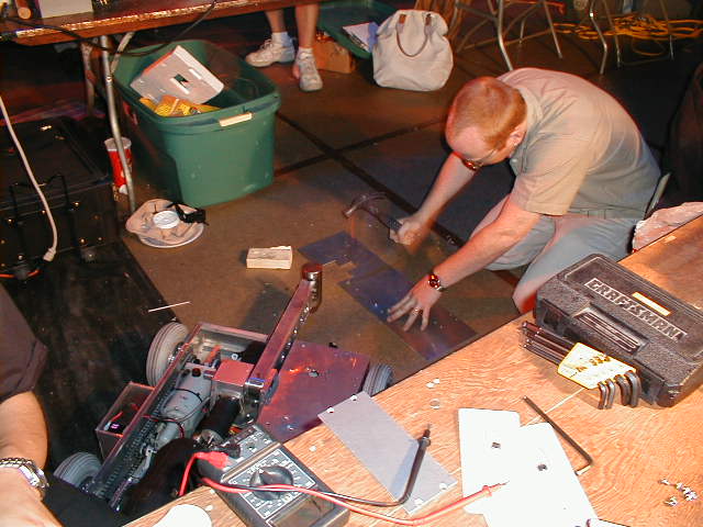 Sunday Morning SOS Vs. Deadblow As it turned out, when the guys were prying the two robots apart, they scraped a crowbar over Deadblow's electronics, shorting out some components - ouch! My win wasn't so heavily deserved after all. Checking out Deadblow's damage however, was cool. My newly added spike put some serious holes in the armour, and there was evidence that it caused damage just millimetres away from the RX at one point! That was all for the morning. We topped up the batteries and watched the robot fights. Some of the best ones happened on Sunday. Some of my faves: Nightmare Vs Killerhurtz, Kill-o-Amp Vs Crock, Ziggo Vs. whoever...