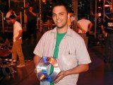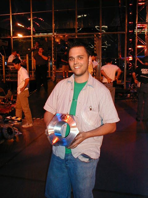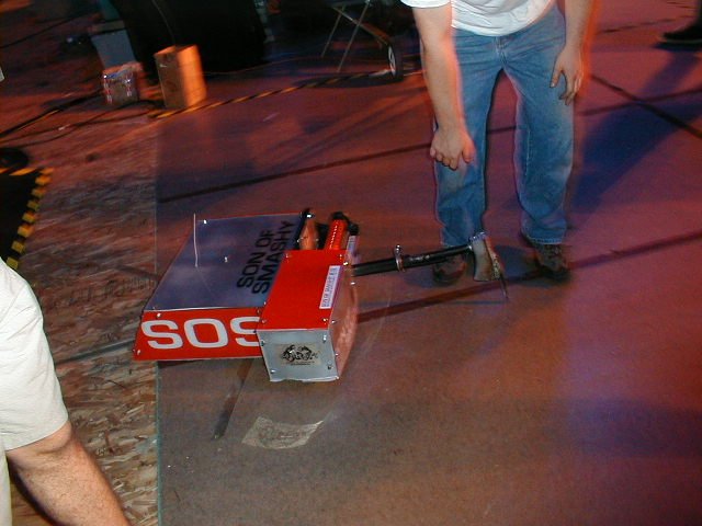 Sunday Afternoon SOS Vs Knee Breaker (Twice) After pulling SOS out of the arena we opened it up to take at look at what happened. Kneebreaker had hit us hard enough to finally break the crappy welds that were holding together the aluminum drive train module pilfered from Mr Smashy. This had knocked the chain off the left hand side, rendering the thing busticated. Oh yeah, one of our motors brush holders had melted and a power wire had fallen off, but it was ok because we've got 4 of them --- let's here it for redundant systems! A mad repair session ensued and we bolted the whole works back together. At this point though we were doing ok, because by winning the match against Knee Breaker, it put us into the finals. We watched the other semi from the losers' bracket, which was Knee Breaker Vs Turtle Road Kill. I didn't really want to face Turtle Road Kill in the finals. The reason was two-fold, firstly it was really solidly made, with a hella thick steel shell, so my chance for fully disabling it was pretty slim, and secondly if it came down to a crowd vote, they had the advantage because it was driven by a little kid. Clint managed to pull it off though, as the kid drove his robot into the saws and flipped it on its lid! And this is after Knee Breaker's chain had fallen off again! I was stoked, as were Clint and Christian. I was really happy to get a rematch against Knee Breaker. The final was very shortly after this, and the match went ok. We started again getting hits in on each other, and either the Smashy device or the saws knocked his drive chain off, and he was declared immobile and Son of Smashy was the winner -- champion even! Crazy! It all happened really quickly. Trey came up to the ring and gave my trophy (the giant machined Al nut). I was just so overwhelmed by the whole thing! On to the requisite post win interview, where I choked and really couldn't think of anything to say. I should have thanked a bunch of people, and I didn't get the chance so I'll thank them now: Thanks to: All the people who sponsored me last year to build Mr Smashy which made it possible to build this robot. My friends Steve and Ed for helping me in the pits and making the trip possible, my girlfriend Gill, who put up with me being busy every night for the 4 weeks before BattleBots, and who unfortunately couldn't make it to LA this time. To the organizers of BattleBots for putting on such a great event. All the other builders who really made the competition a great time. I could go on... After coming to grips with winning, I realised that I had to still compete in the robot rumble at the end! We quickly switched the batteries and pulled SOS back into the ring, this time with all the other Megabots in there too! This was bound to be crazy. Before the rumble Ilya and crew visited all the Megabot teams making sure that all robots were to gang up on the robot Stuffie - who had had it too easy all weekend. It was all agreed, (most teams already had this in mind The rumble was pretty fun in the end, but the other side of Son of Smashy's drive train suddenly died, and I got stuck against a wall. I convinced Ilya, who was standing beside me to get Carnivore over to unstick me, but I played a cruel trick and started pounding on his robot when he got near. It was all in good fun though, and Ilya said later that the holes looked cool. I watched a bit of what was going on, and it was pretty clear that Grant's newly repaired Deadblow was taking control. He ended up winning the rumble which was a nice bonus for him, especially after working all day to get his robot working again. It was all over for us at this point, so we cracked some cans of cheap American beer (Busch I think) and grabbed some food out of the courtesy room and sat and watched the rest of the event. We talked to some of the spectators, hung out with team Finagler and did an interview for Playboy Online. The kilo and giga rumbles were crazy, and I won't bother describing them here. You'd have to see it to really appreciate it. After all was said and done, we started to clean up and pack up our gear. An hour or so later, we had the Escort loaded and were ready to roll. We said our final good byes and hit the highway at 11pm. BattleBots was over, and we had a big aluminum nut sitting on the floor in front of our car's passenger seat, and a cheque in the mail. The trip was a success. We had originally planned to go to Las Vegas on the way home, but we figured we were leaving pretty late, and we shouldn't push our already shining luck. We were on our way back to Canada.