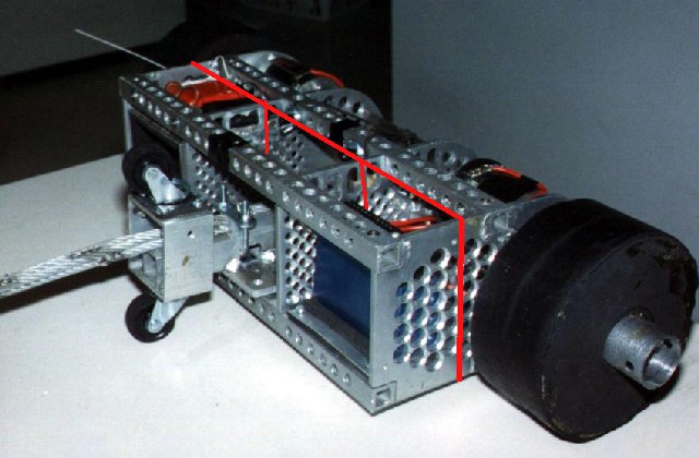 ![]() Step one in building a robot, is to take an old robot, (here we use Derek's creation from last year, Mr Smashy), and cut it in half along the red lines. No problem! Set aside the remaining aluminum bits for later. The old drive train was retained for a few of reasons: 1. It worked just fine before, 2. it could be geared down to drive a 100 lb robot, and 3. I really couldn't afford the time or money to build another one.